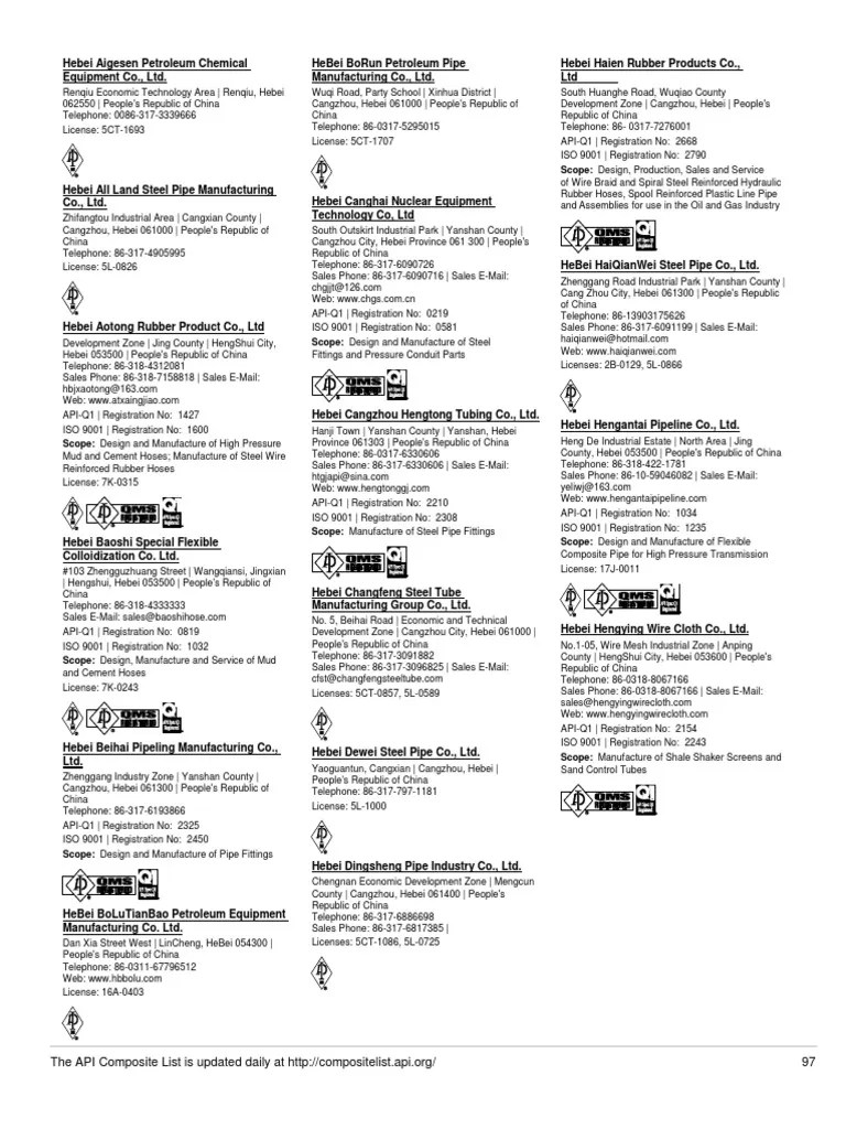 The 15th china international petr. Tianjin tiangang special petroleum pipe manufacture co., ltd. Self developed tc serial coating is capable of quickly responding to customers' special needs, and provide high quality, differentiated coating service. Zhengzhou sapwells petroleum machinery manufacturing co., ltd., is a professional oil equipment and spare parts manufacturer, also the service supplier. 5 exporters are listed on 1 hebei borun steel trade co.,ltd is an experienced manufacturer & exporter of octg pipes. 86 petroleum pipe manufacture co. All the lines are busy at the moment, please try again in a moment. 5d, water (steam) pipes, anticorrosive pipes, and various mechanical products. Jiefang road ,yunhe zone,cangzhou city, hebei,china cangzhou, hebei. Dongying shengli petroleum equipment and technology service co., ltd. Alibaba.com offers 3,338 api petroleum pipes products. Foreign trade through the technical team, in the years of oil pipe , casing pipe , api pipe , octg , steel pipe , tubing , coupling , casing , drill pipe , threaded pipe based on the painstakingly created a new. View contact details for hebei sloate petroleum pipe manufacturing co., ltd including address, map, contact person, telephone and fax number.